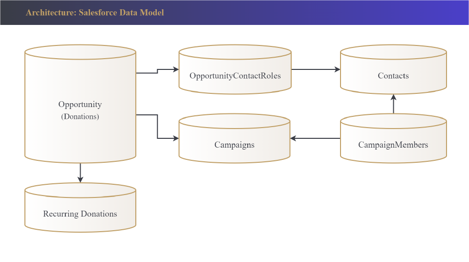 Salesforce data model for connecting donations to the campaign that won them and the contacts who made each donation.