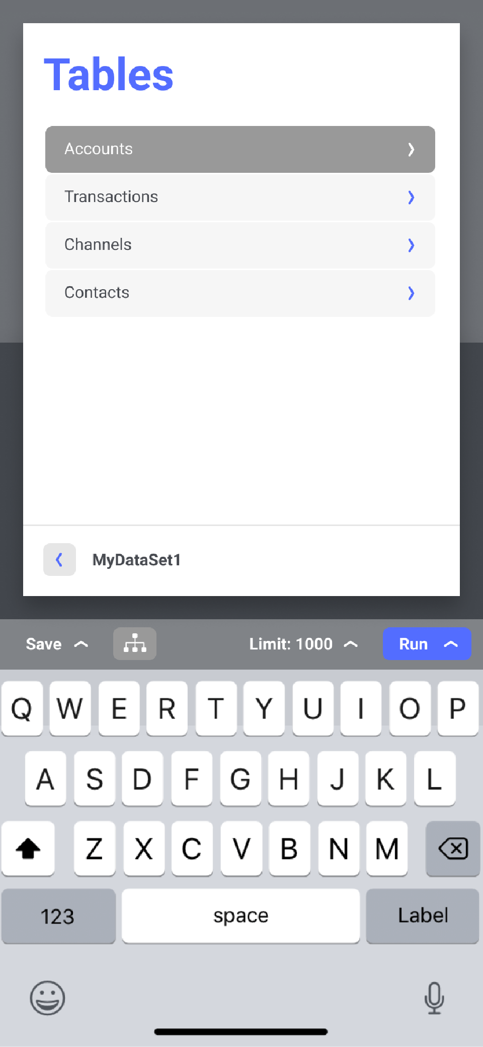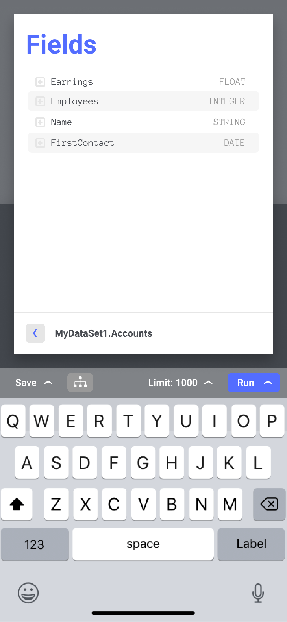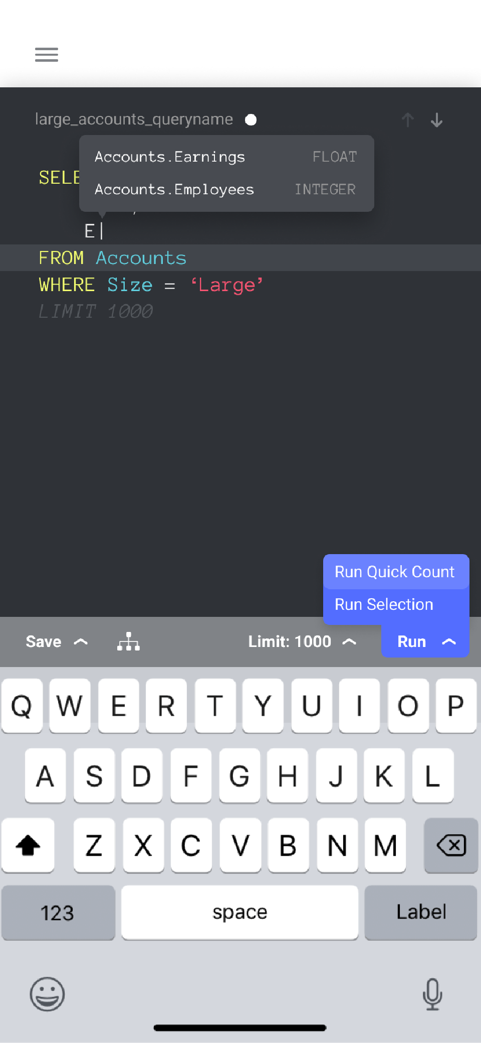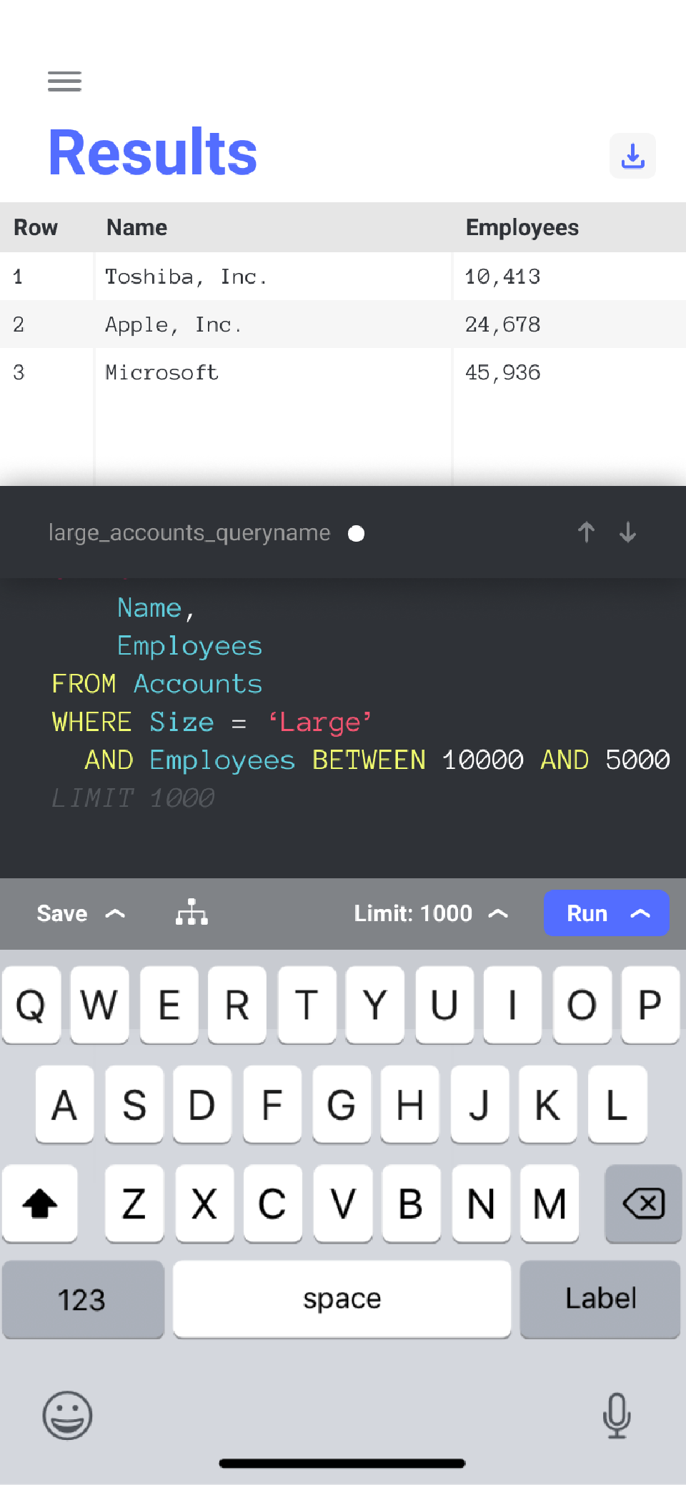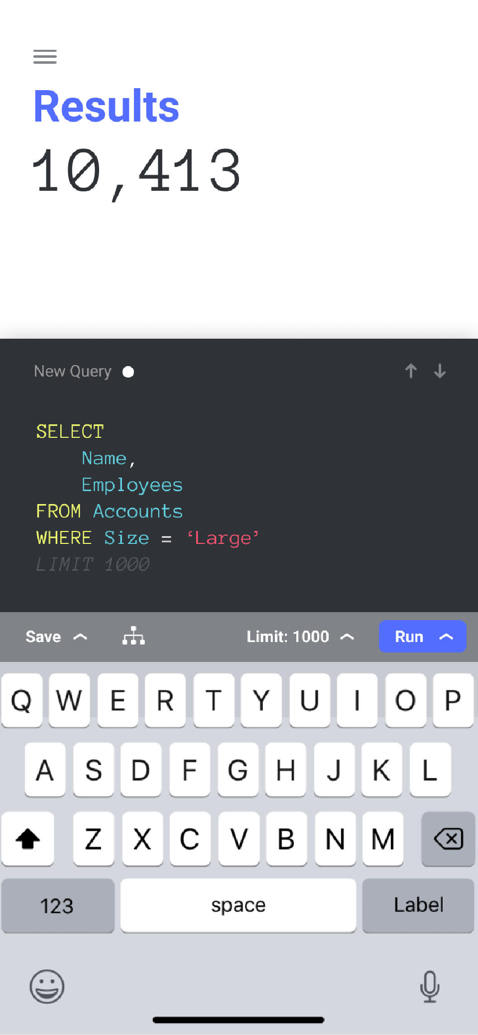 When you’re writing your queries, it’s often helpful to see a small selection of results. Here you can see the results inline with the editor. Notice the “Limit: 1000” button at the top of the keyboard — this can be changed and turned on and off while you write the query.