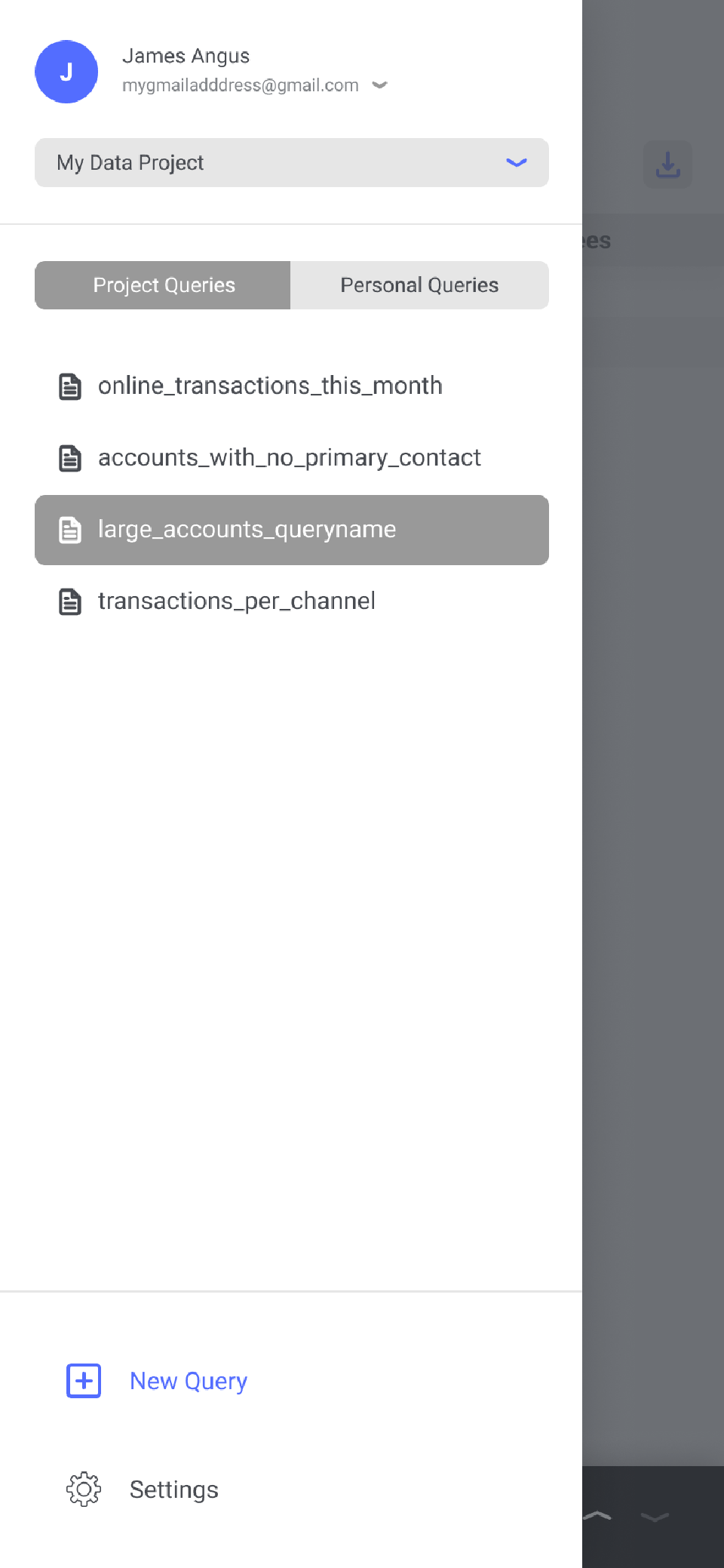 The app needs to allow you to login to multiple Google Accounts and projects. In BigQuery you can also save personal or project queries. The menu provides affordances for all of these scenarios.