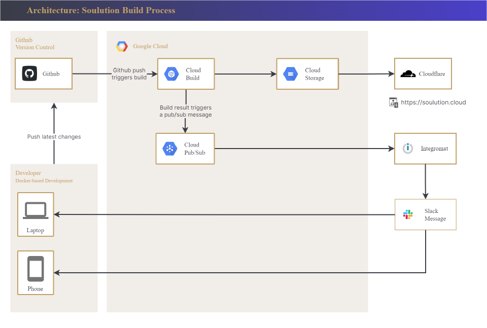 branch and then kicks off a build. The result is copied to a Google Cloud Storage bucket and finally, Cloudflare handles proxying the website at https://soulution.cloud.