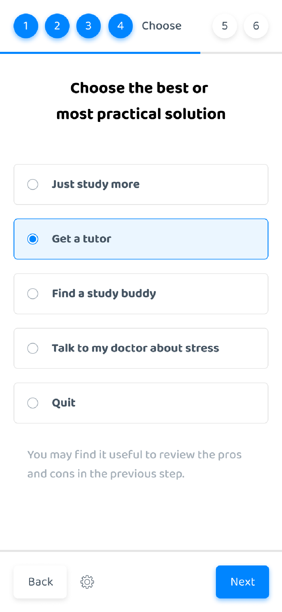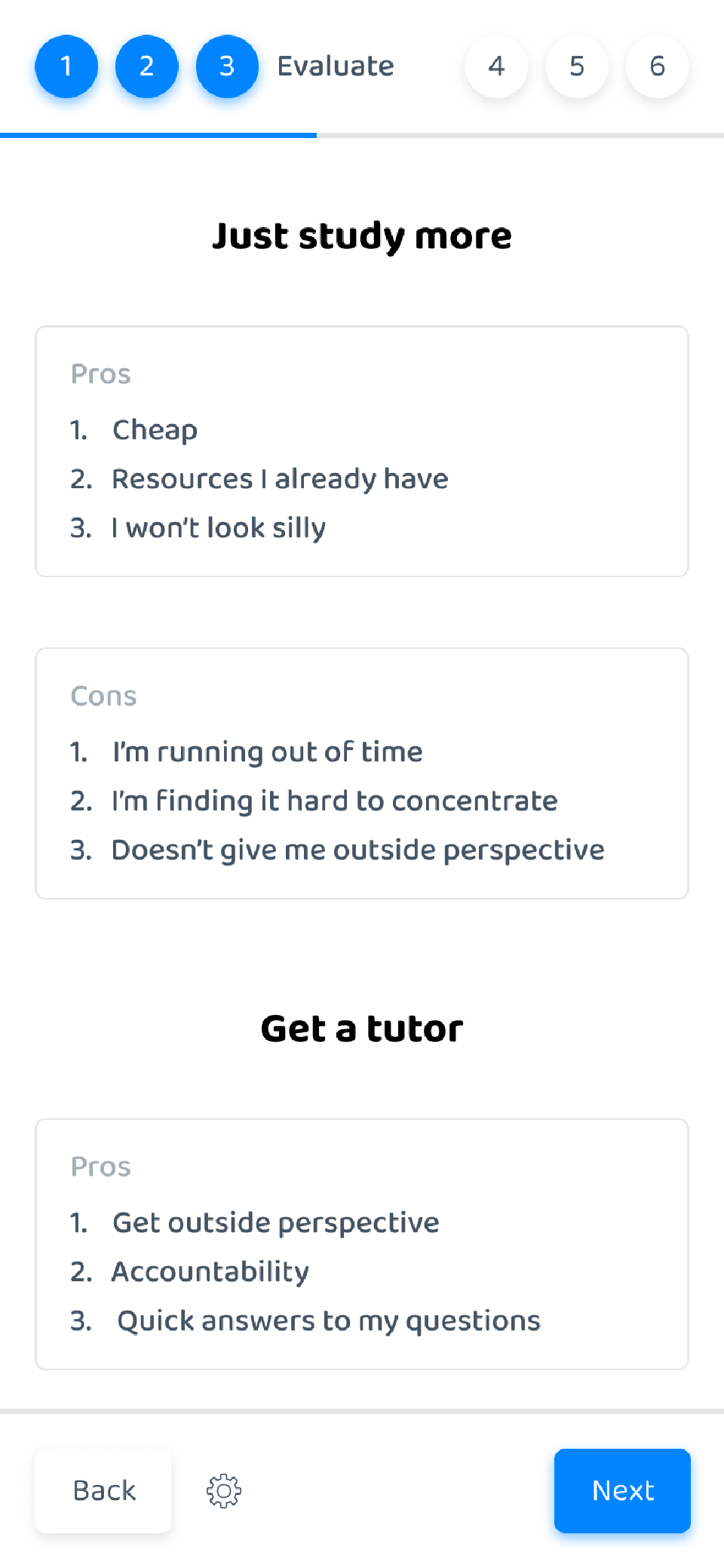 Again, we use the custom list form element to help people think through the pros and cons of each option they listed in the previous step.